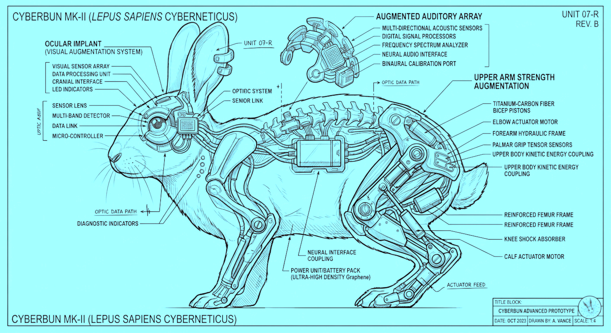 A blueprint of a Scout cybernetic enhancement project, providing the subject with additional rear leg strength and speed, and enhanced visual and auditory capabilities.
